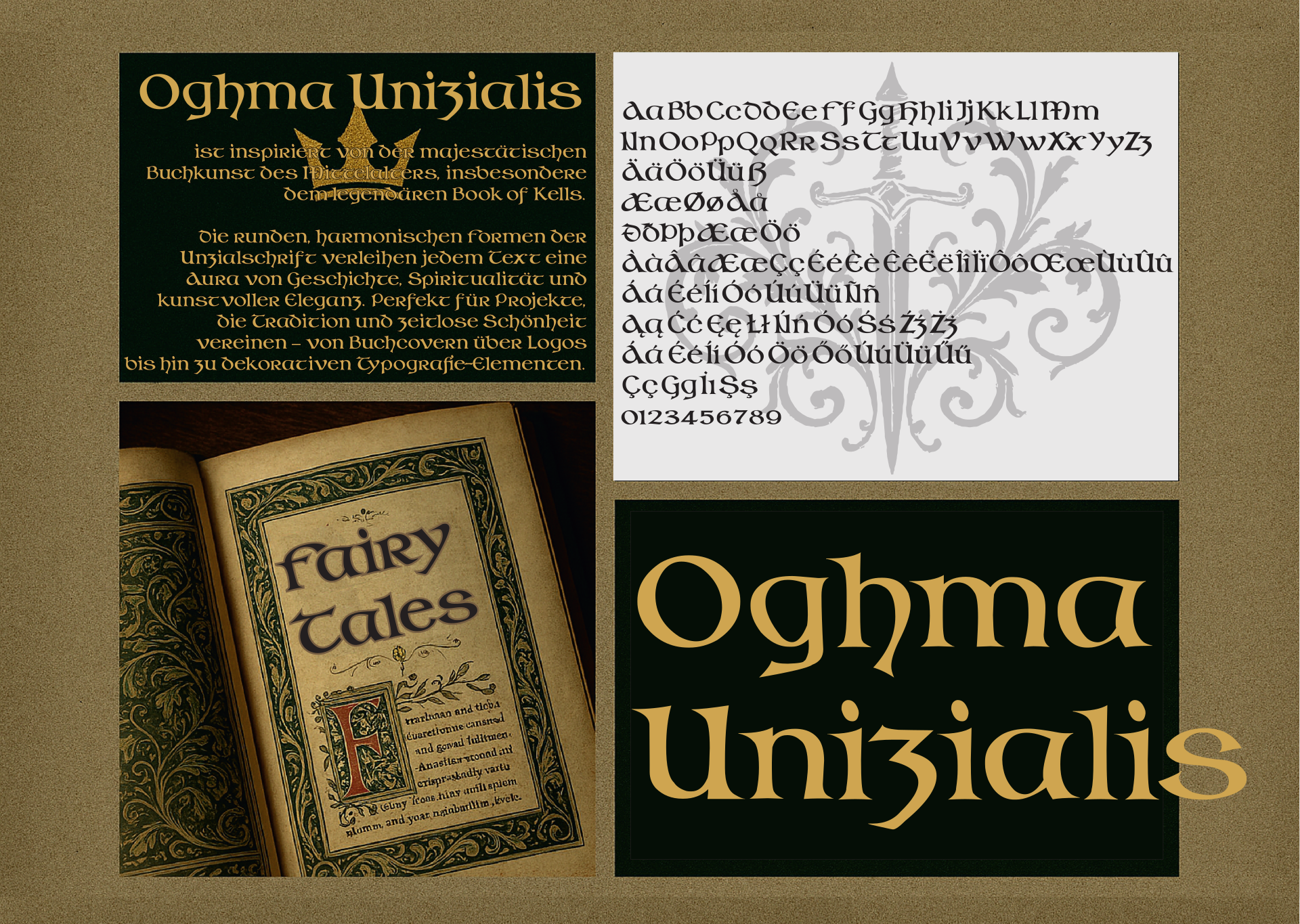 Historisch inspirierte Unzialschrift mit markanten Rundformen und keltischem Charakter.